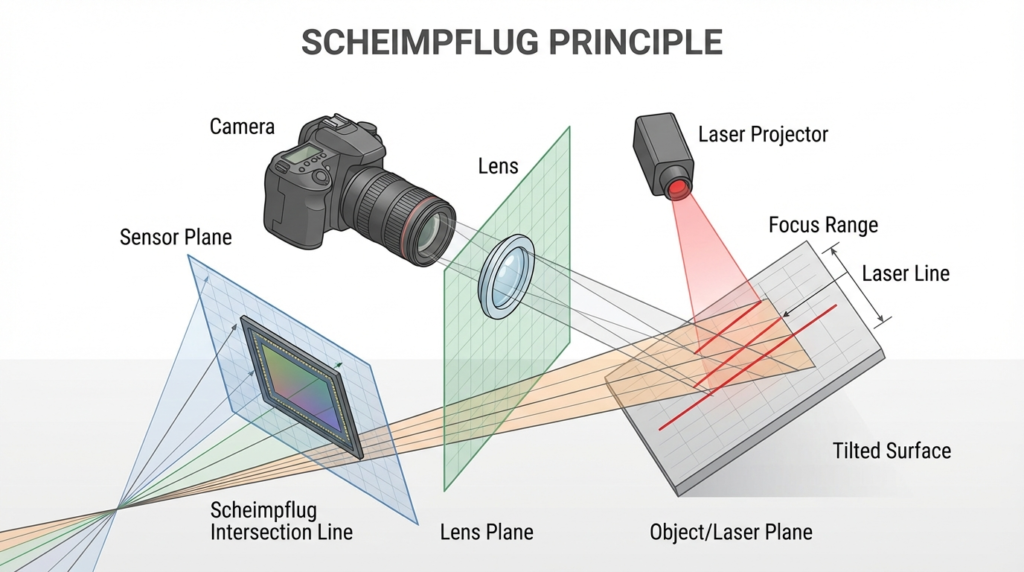 در سنسور پروفایل لیزری، دوربین با زاویه به سطح نگاه میکند که معمولاً باعث میشود بخشی از تصویر تار شود. اصل شایمپفلوگ با زاویهدار کردن لنز و سنسور نسبت به هم، باعث میشود که تمام خط لیزر در عمق میدان دید (Focus) قرار گیرد. این تکنیک تضمین میکند که دقت اندازهگیری در تمام بازه ارتفاعی سنسور یکسان و بالا باشد.
