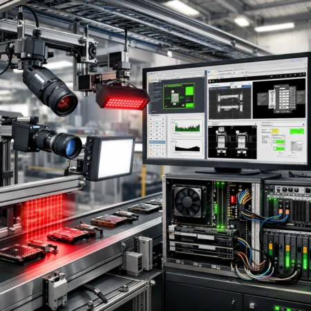 نرمافزار: پلتفرمهای توسعهی بینایی ماشین (مانند Halcon, OpenCV, LabVIEW, VisionPro)، کتابخانههای الگوریتمی، و رابطهای کاربری برای پیکربندی و مانیتورینگ.